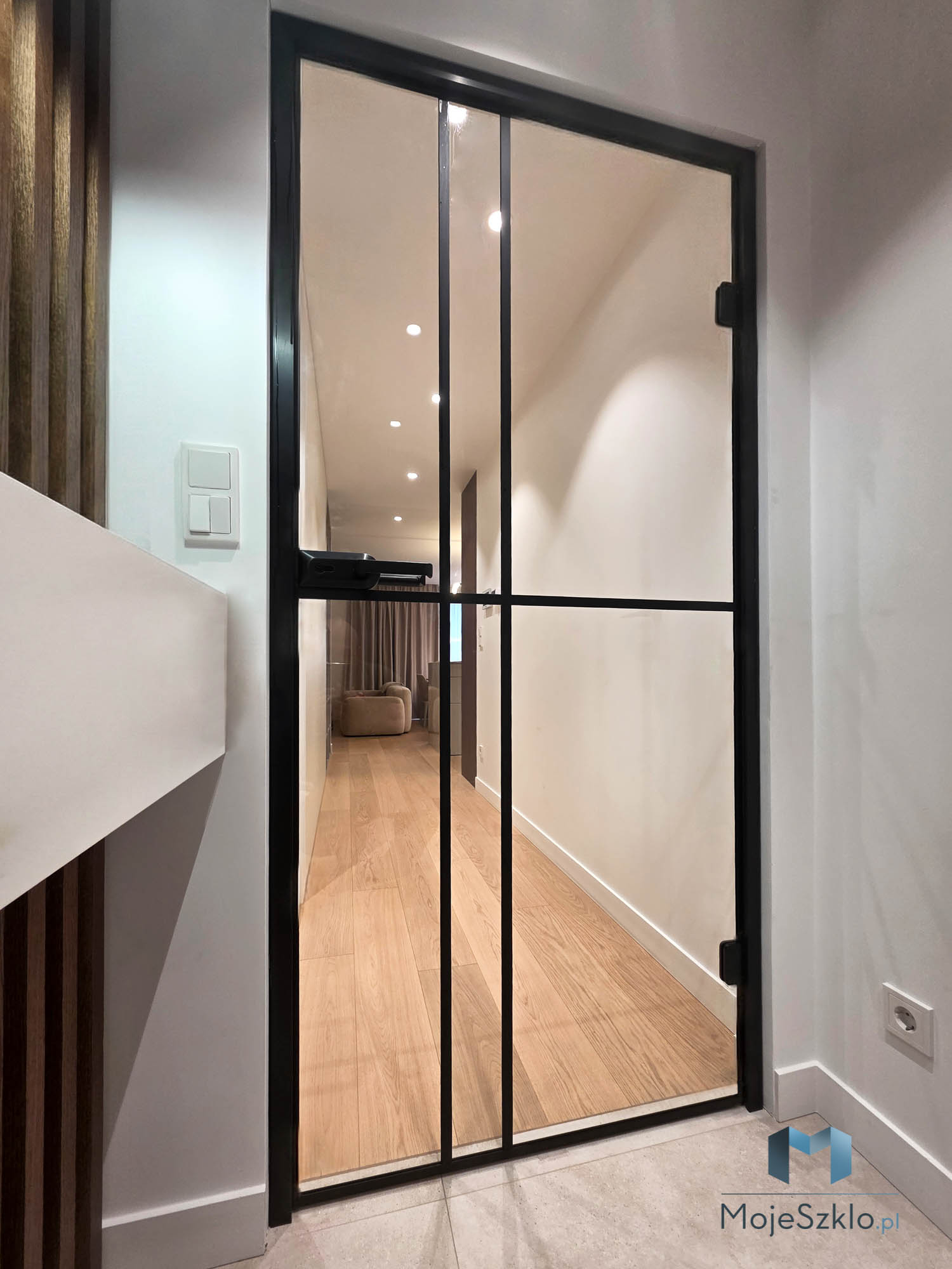Czarna ościeżnica doskonale kontrastuje z przejrzystym szkłem, tworząc ciekawy efekt wizualny.