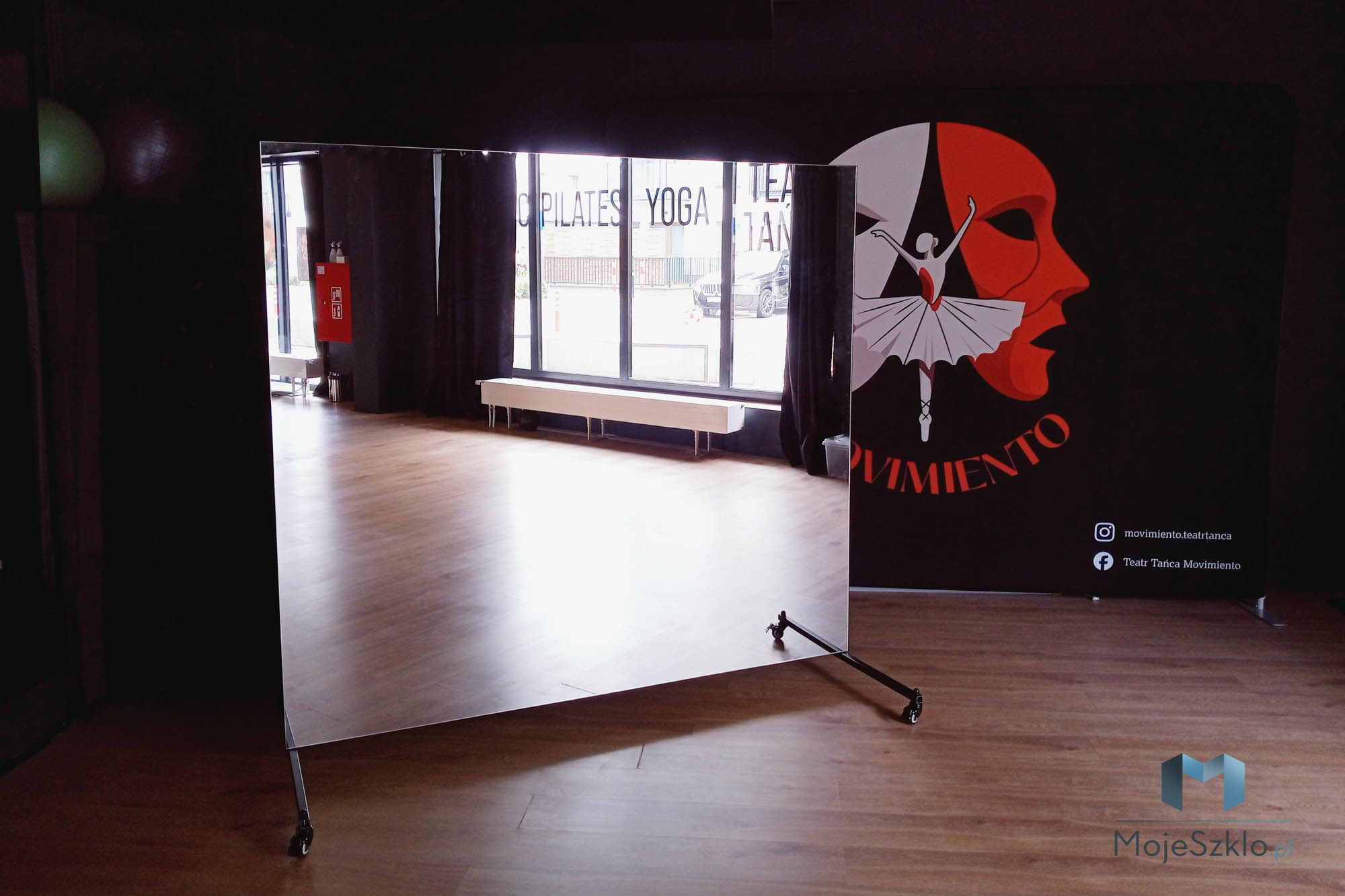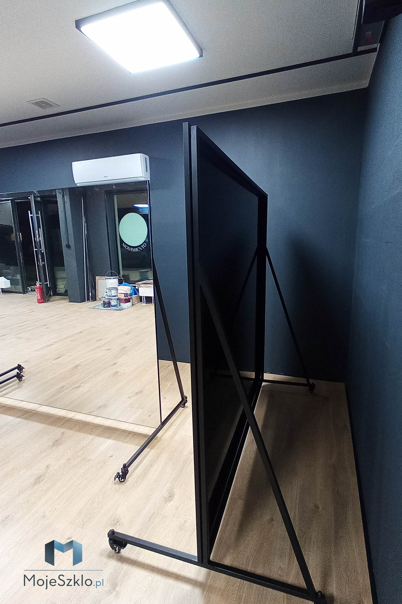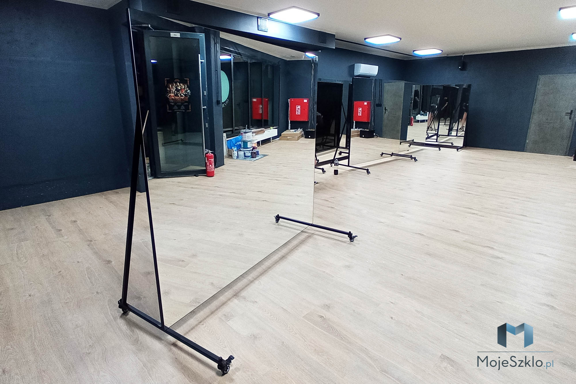 Alternatywnym rozwiązaniem jest lustro na kółkach. Może być wykorzystywane tam gdzie nie ma możliwość bezpośredniego montażu lustra na ścianie, np. w przypadku gdy istnieje duże ryzyko rozbicia. Dodatkowym atutem jest możliwość swobodnego przemieszczania, dzięki czemu może być wykorzystywane w kilku salach.