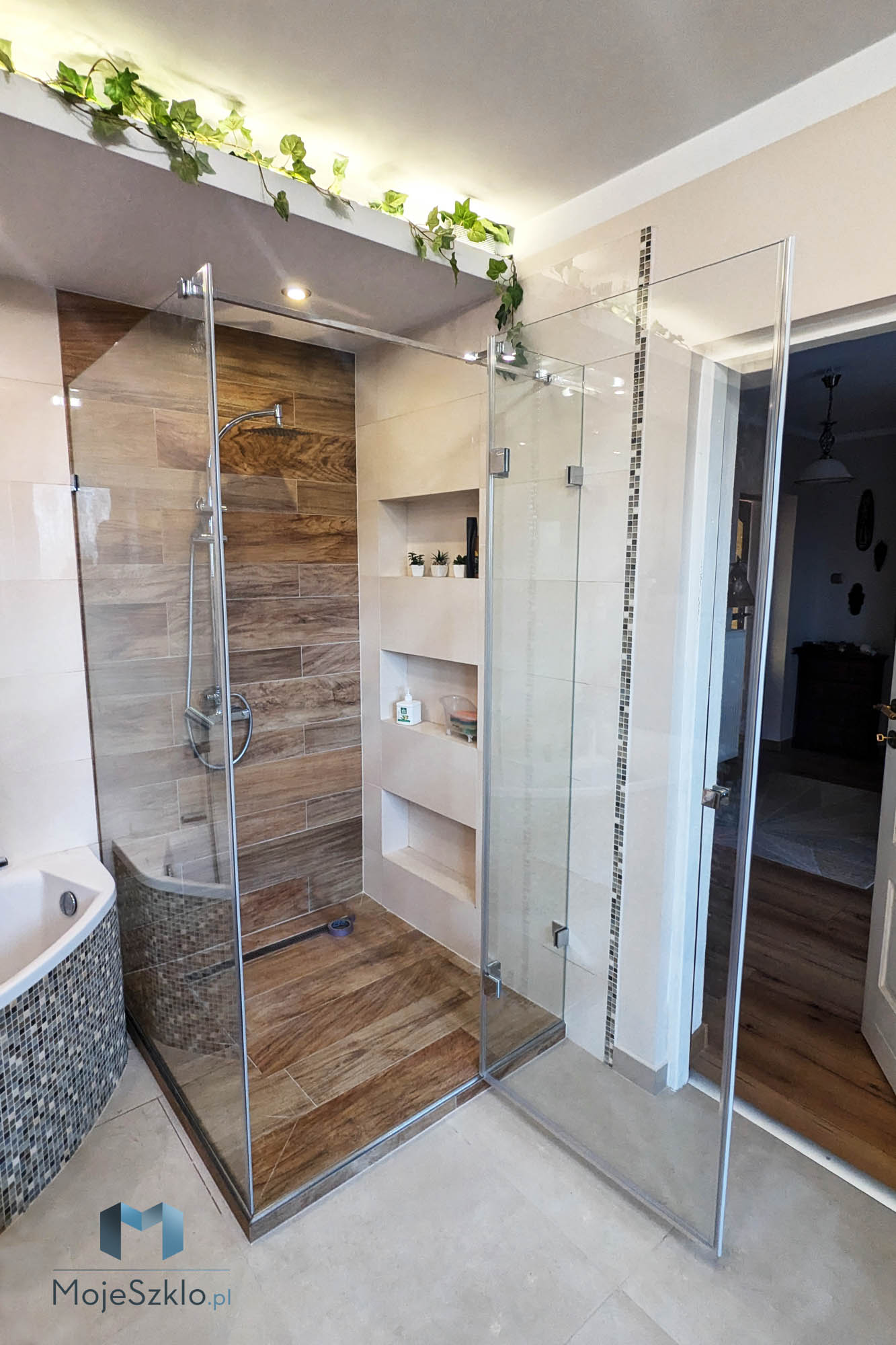 Kabina narożna może być umiejscowiona zaraz obok wanny. Odpowiednia wysokość szyby pozwoli optymalnie wykorzystać przestrzeń.