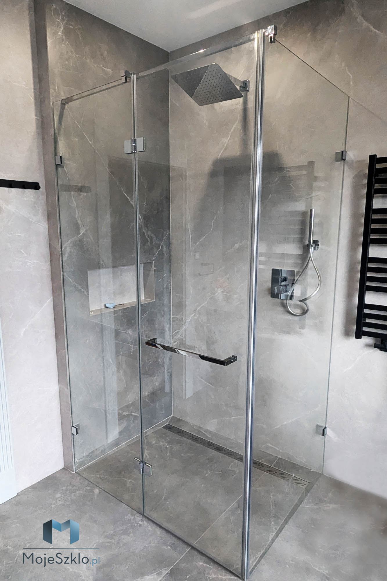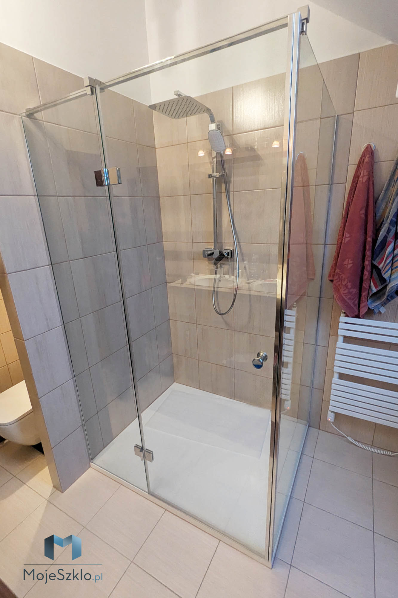 Kabina narożna składa się zazwyczaj z bocznej ściany stałej oraz ściany wejściowej, gdzie drzwi mogą być na całą szerokość lub zostać podzielone na część stałą i drzwi. Takie rozwiązanie stosujemy kiedy szerokość ściany przekracza 90 cm lub na ścianie obok jest jakiś element (umywalka, grzejnik).