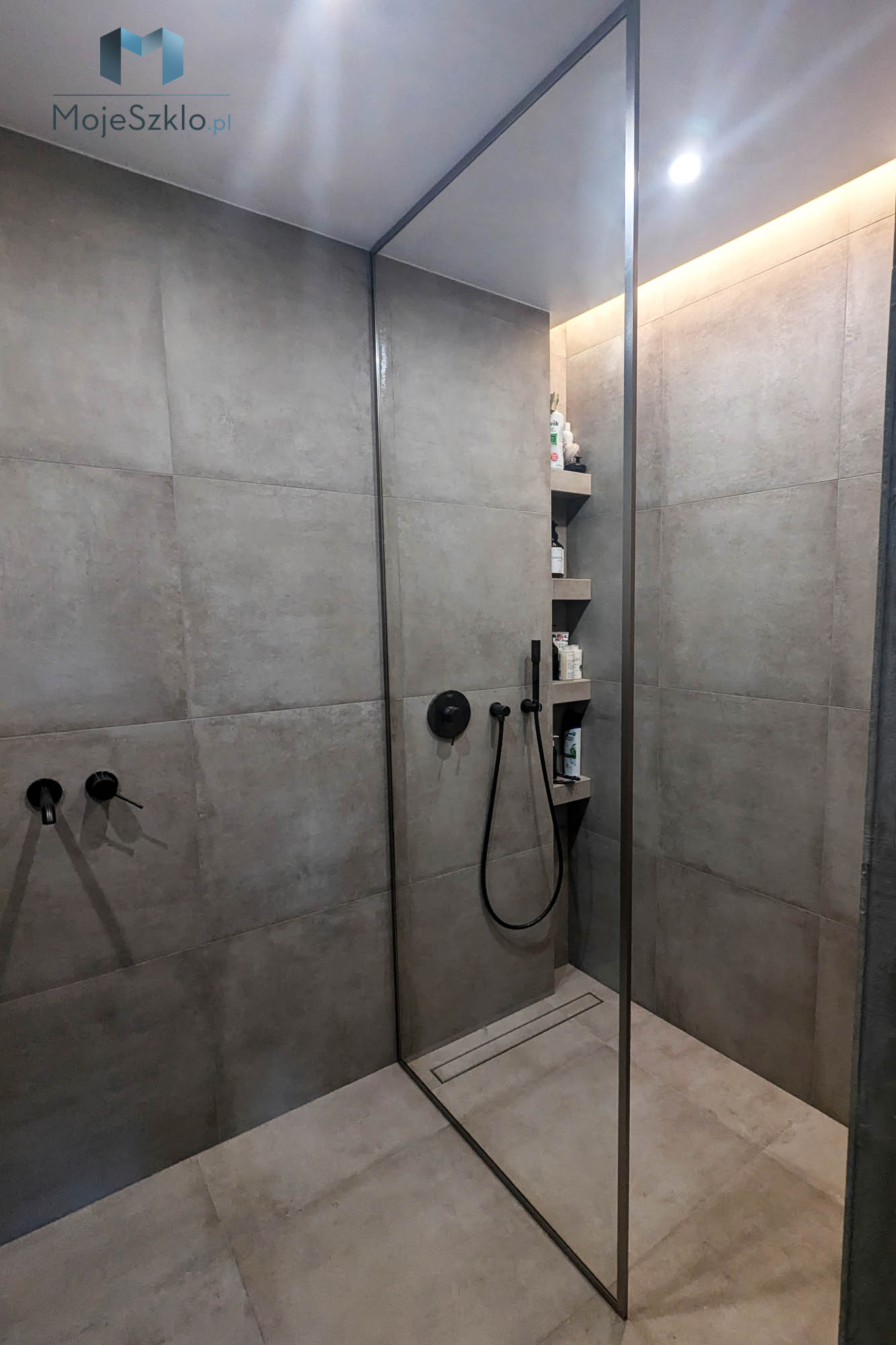 Szyba może być zamocowana w dylatacji w płytkach. Jedynym widocznym elementem będzie wtedy drążek.
