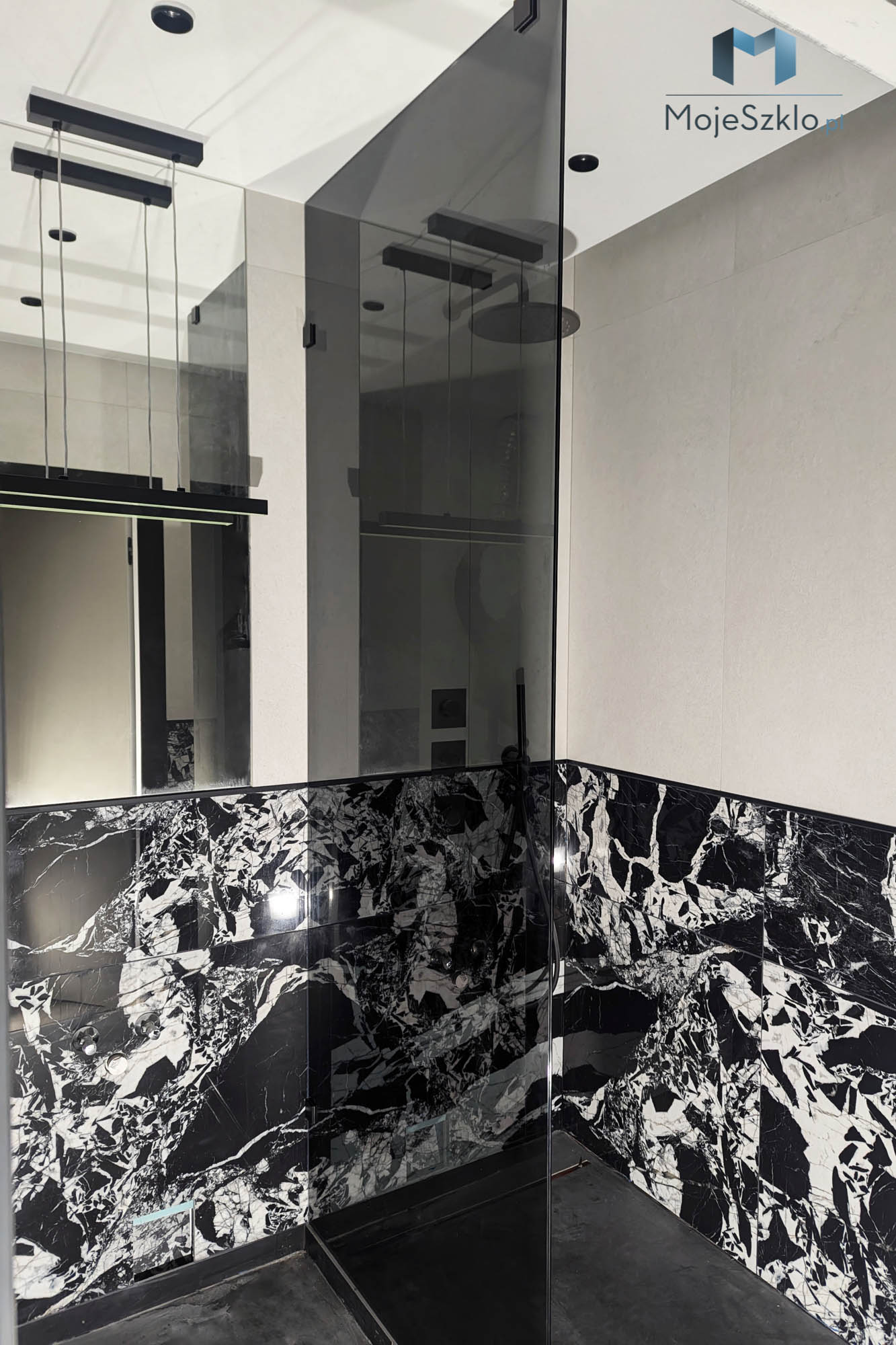 - Szyba do ściany jest zazwyczaj mocowana na dwóch okuciach punktowych do ściany i jednym do podłogi.