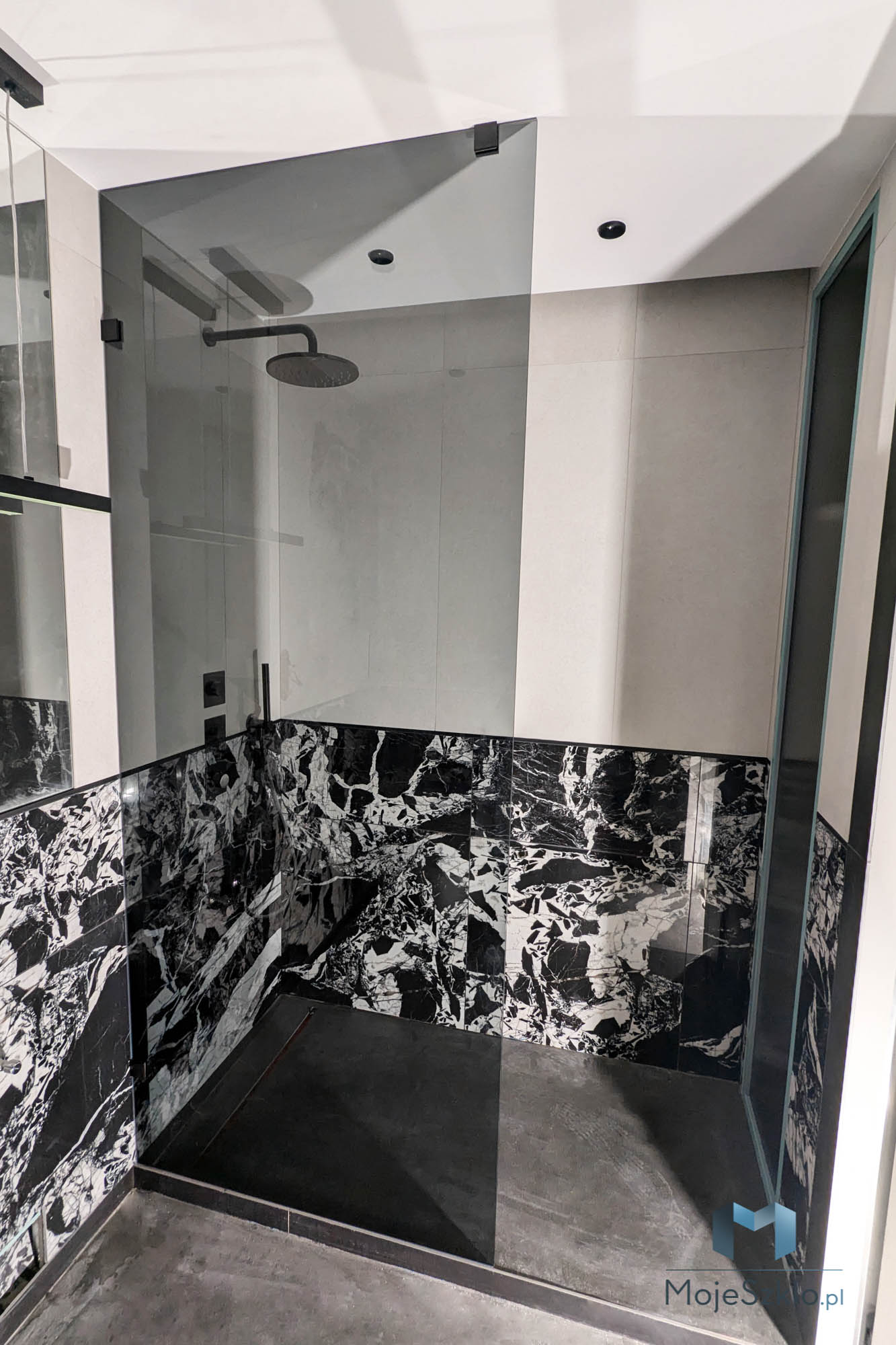Ścianka prysznicowa może też mieć dodatkowe stałe elementy. Takie rozwiązanie może być przydatne, gdy chcemy ograniczyć rozchlapywanie wody, a jednocześnie zachować minimalistyczną formę prysznica.