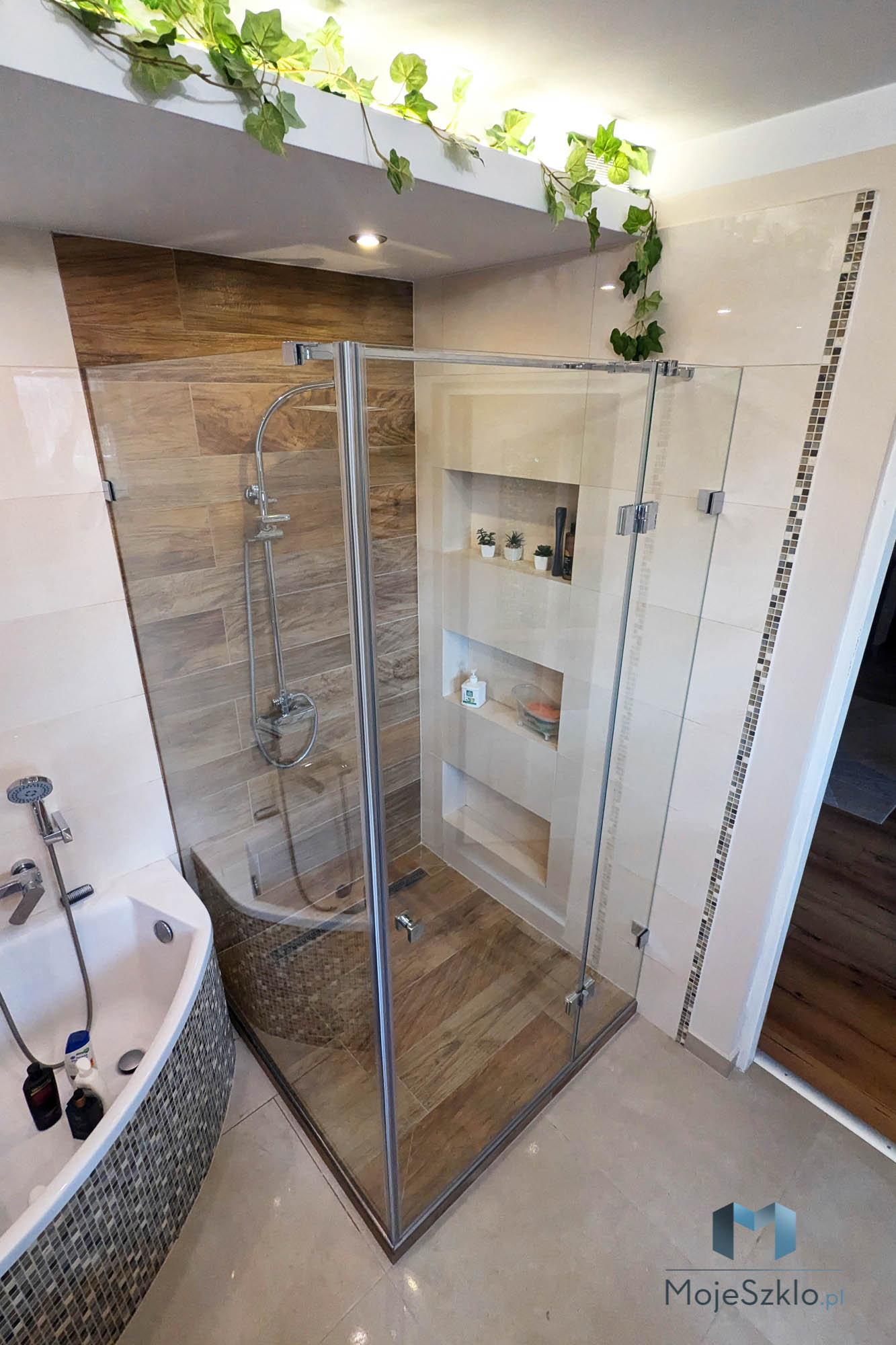 - Wszędzie tam gdzie szerokość wnęki jest zbyt duża na same drzwi szklane stosujemy drzwi z elementem stałym. Taka kabina prysznicowa może być w formie drzwi wiszących na części stałej lub z zawiasami przymocowanymi do ściany.