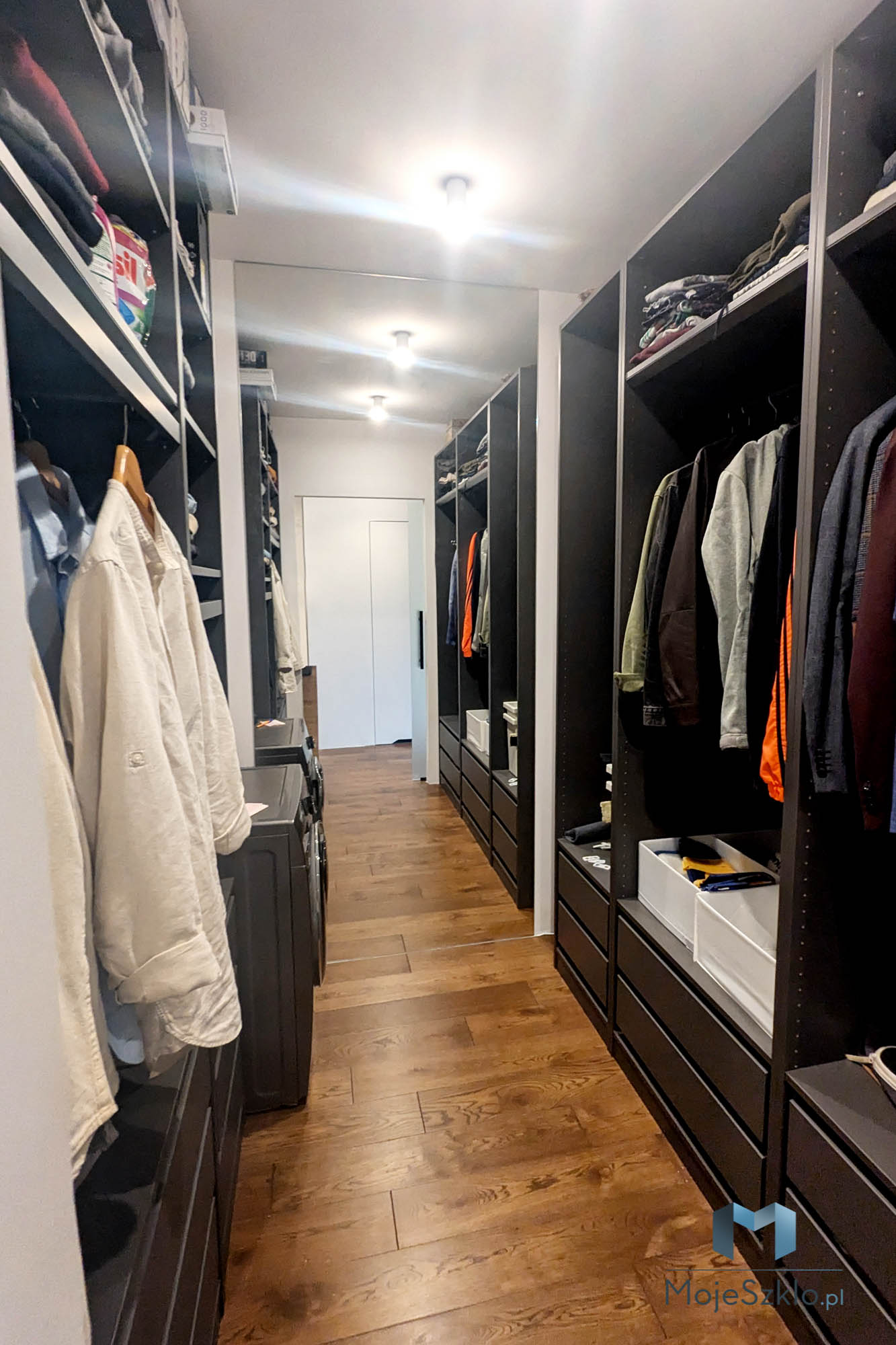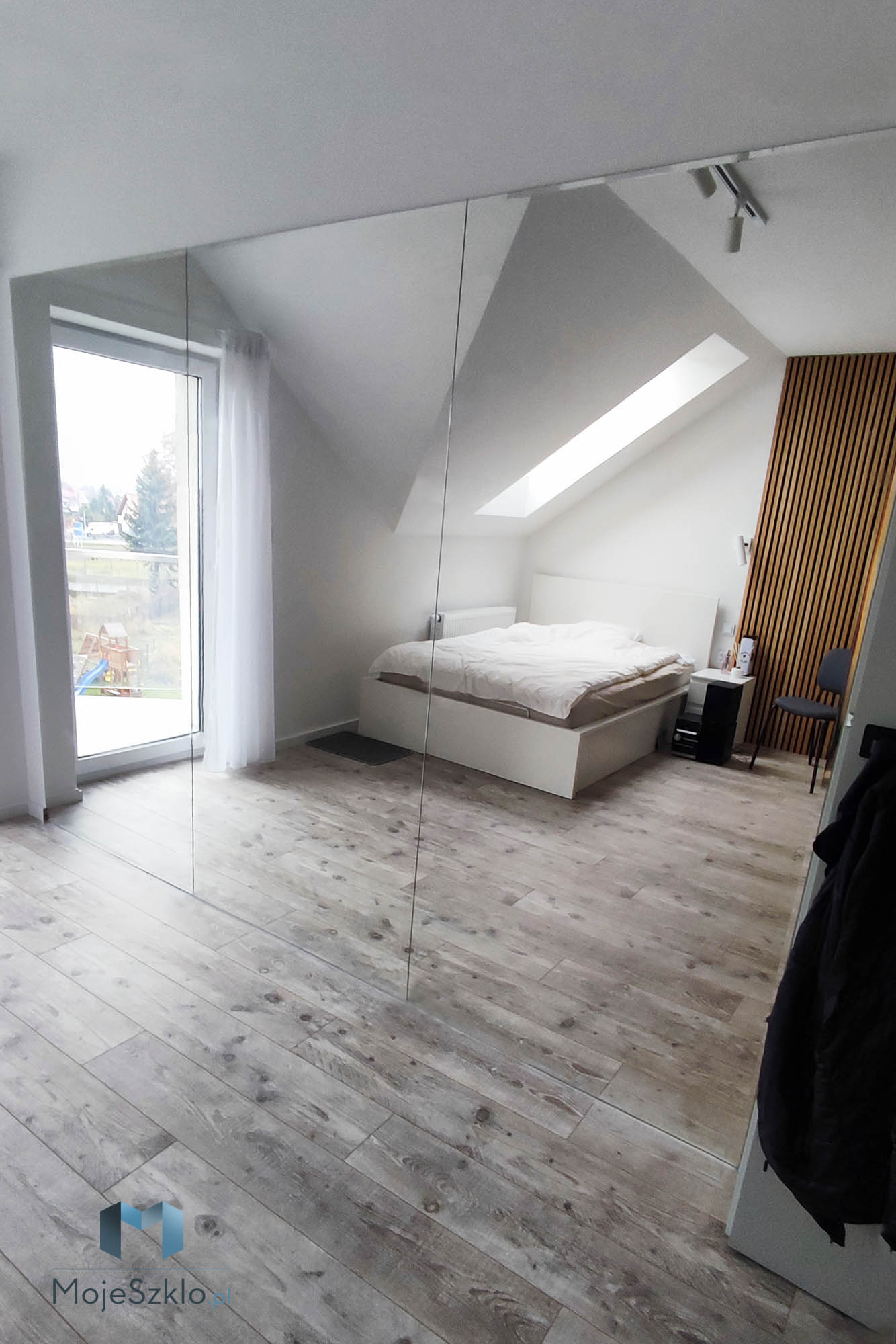 W tej realizacji wykorzystaliśmy lustro weneckie Mirastar o grubości 4 mm z hartowaniem. Szkło zostało przyklejone do sufitu, a także dodatkowo zamocowane za pomocą rotul.