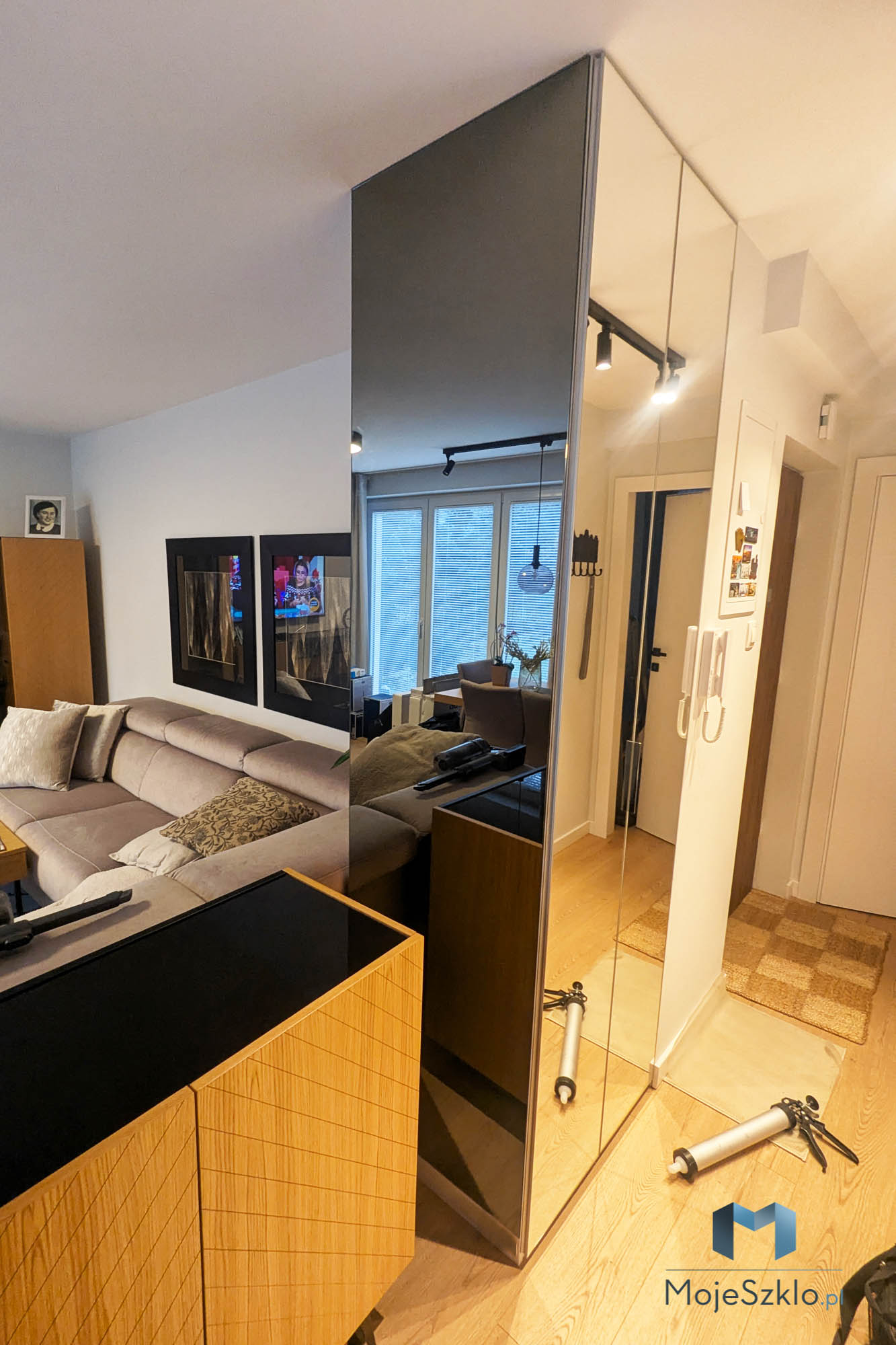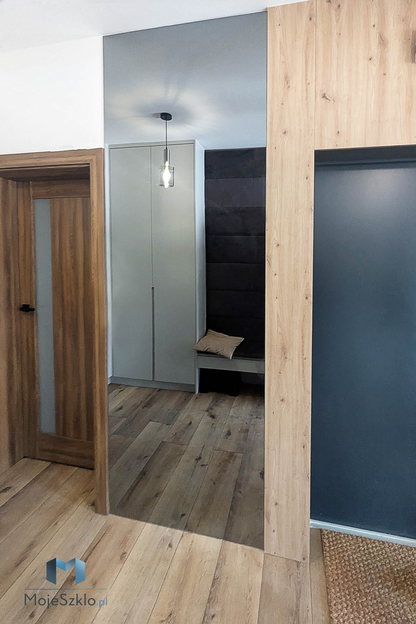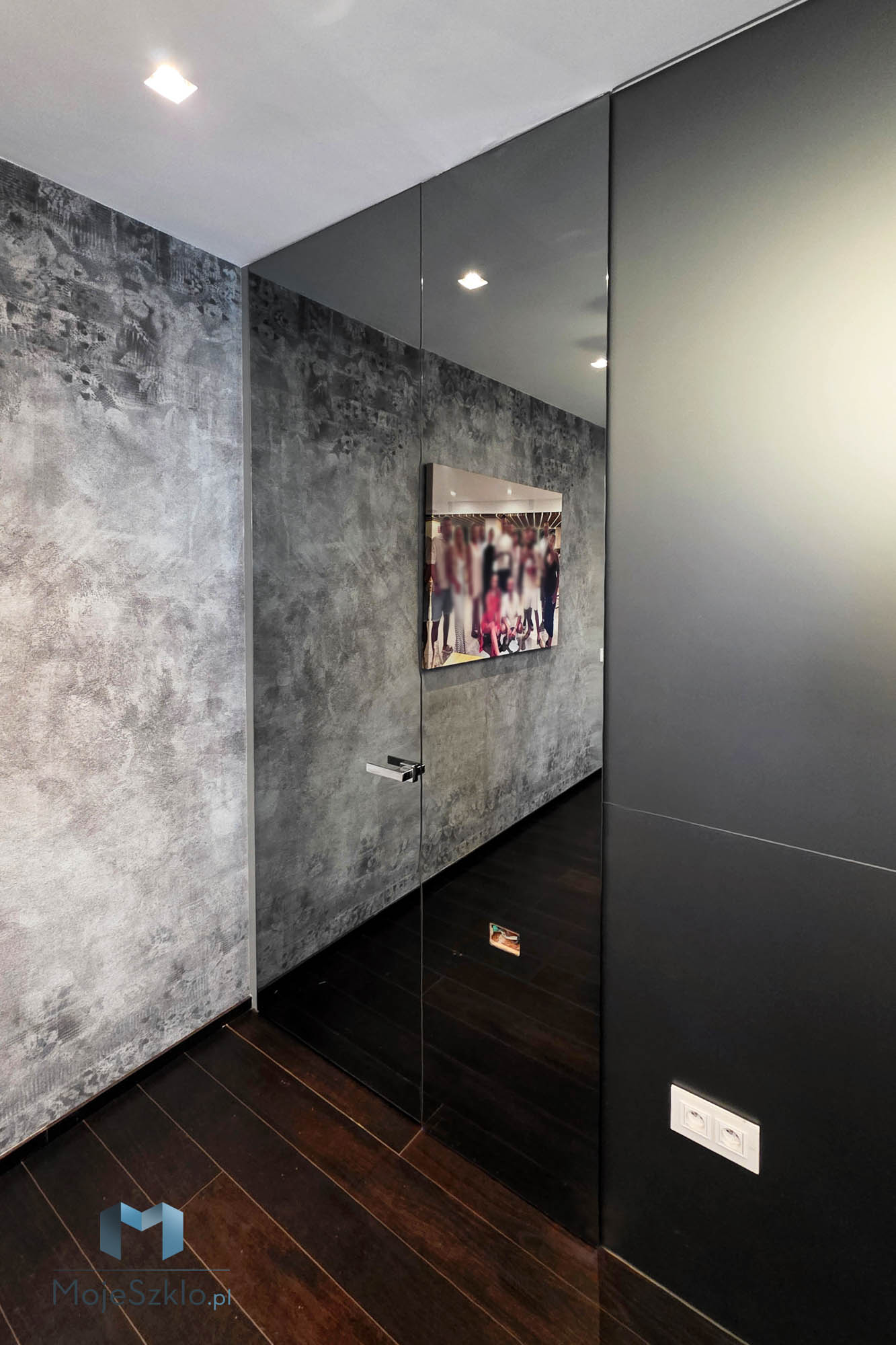 Lustro grafitowe na całą ścianę tworzy bardziej subtelny efekt niż tradycyjne lustro srebrne. Jego przyciemniona powierzchnia delikatnie odbija światło, nie przytłaczając przestrzeni, co sprawia, że wnętrze zyskuje nowoczesny charakter bez nadmiernej intensywności.
