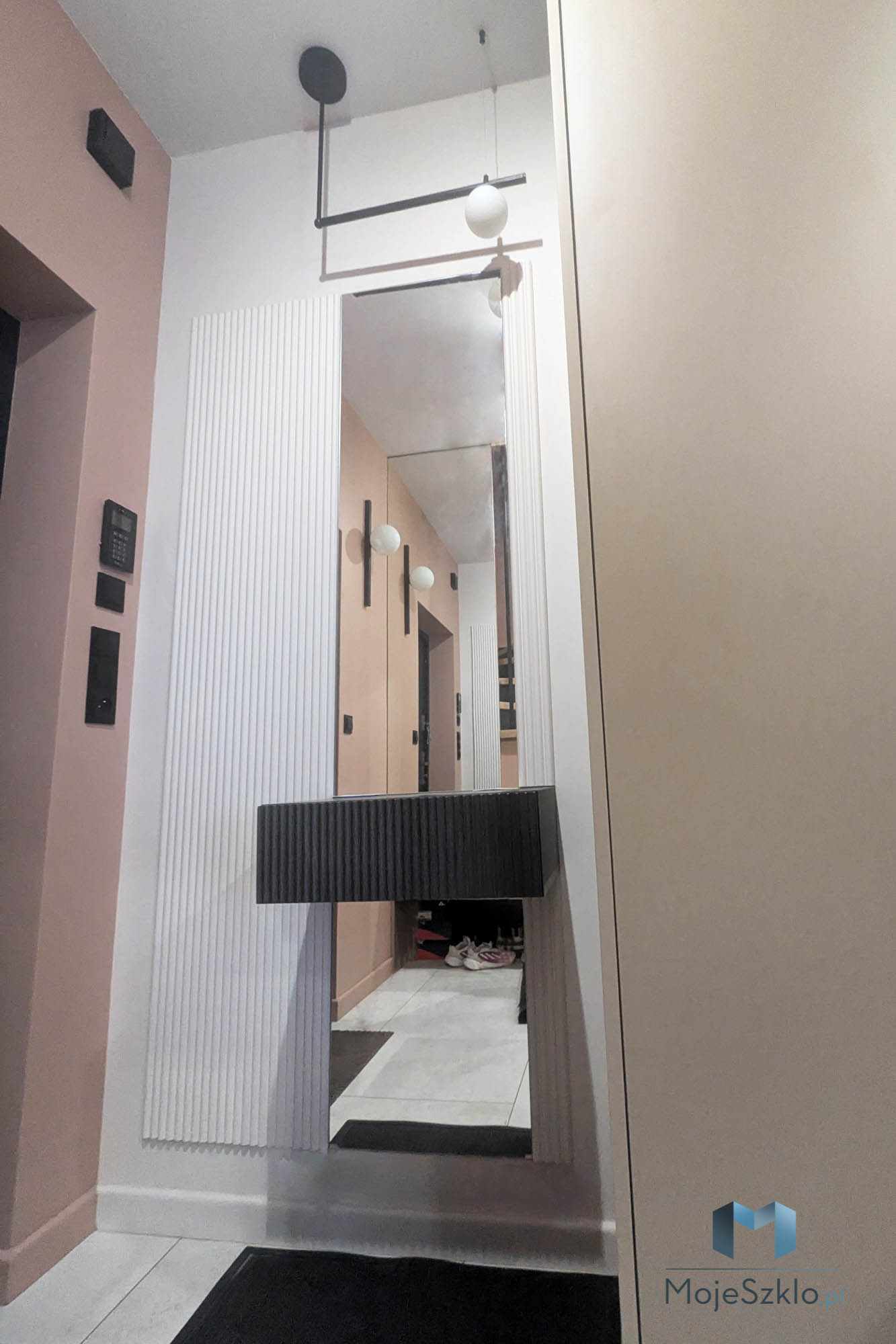 Lustro może być podzielone na dwie części – górną i dolną, z półką umieszczoną pomiędzy nimi. Rozwiązanie idealne do wysokich przestrzeni.