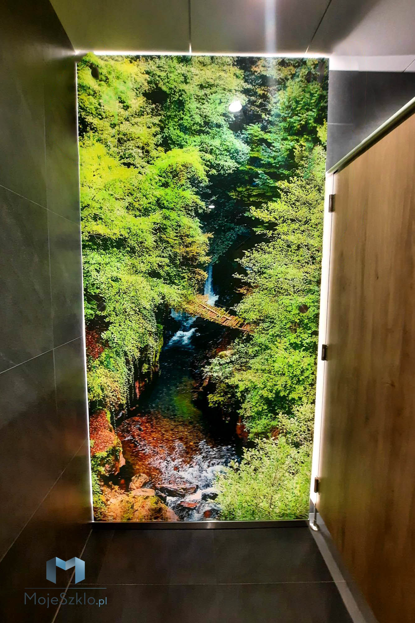 W centrum badawczym Ryvu Therapeutics zrealizowaliśmy nowoczesne rozwiązania szklane, które wzbogaciły wnętrza o elegancję i funkcjonalność. W projekcie wykorzystaliśmy podświetlane panele szklane na rotulach, które ozdobione zostały grafikami nawiązującymi do natury. Wiele paneli przedstawia wodospady – popularny motyw idealny do zastosowań w łazienkach, który dodaje wnętrzu spokoju i relaksacyjnego charakteru.