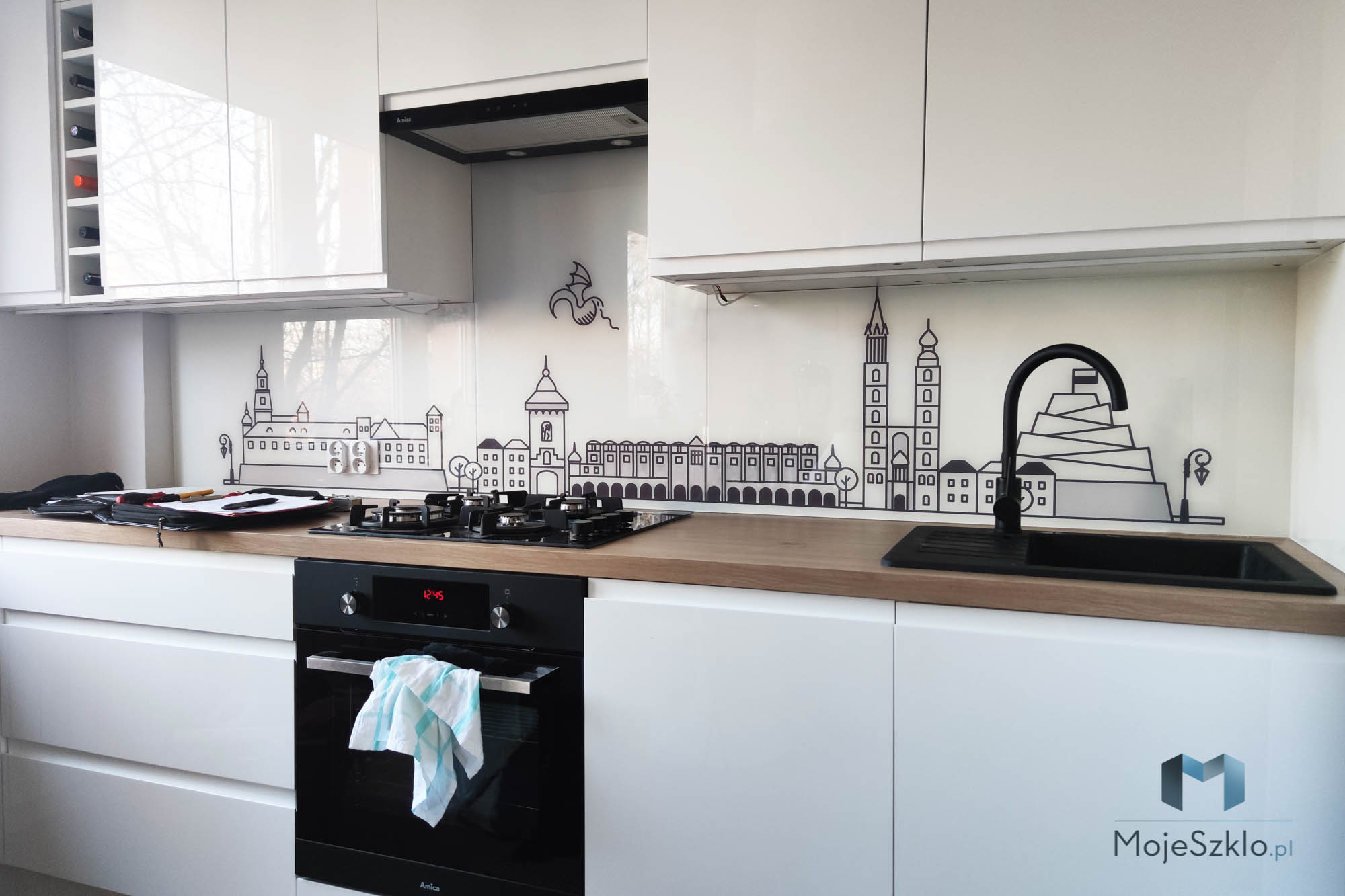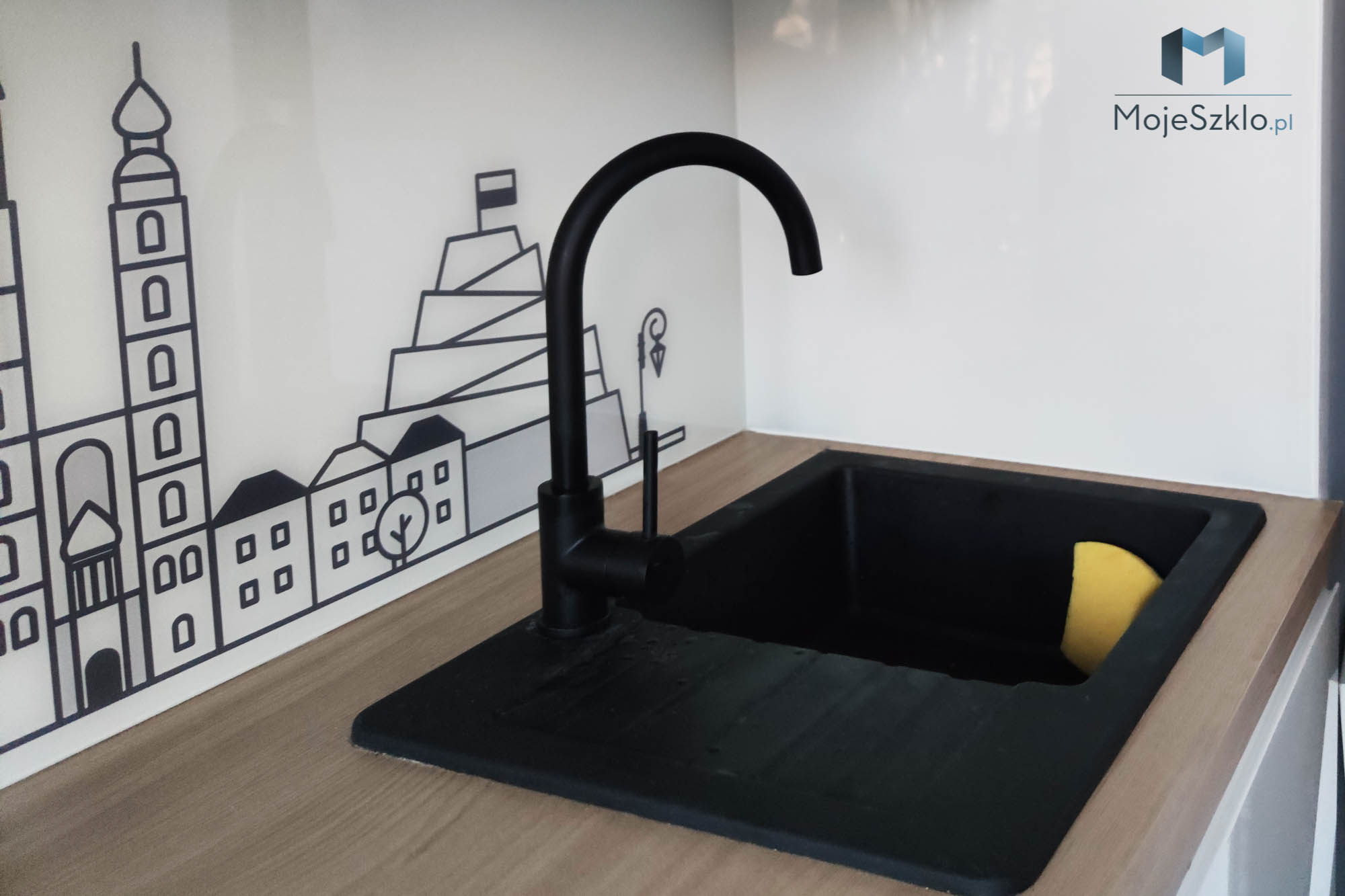 Czarno-biały szklany panel przedtawiający miasto nada kuchni nowoczesny charakter. Połyskujace światełka budynków zachowane w monochromatycznej tonacji zdecydowanie robią wrażenie.